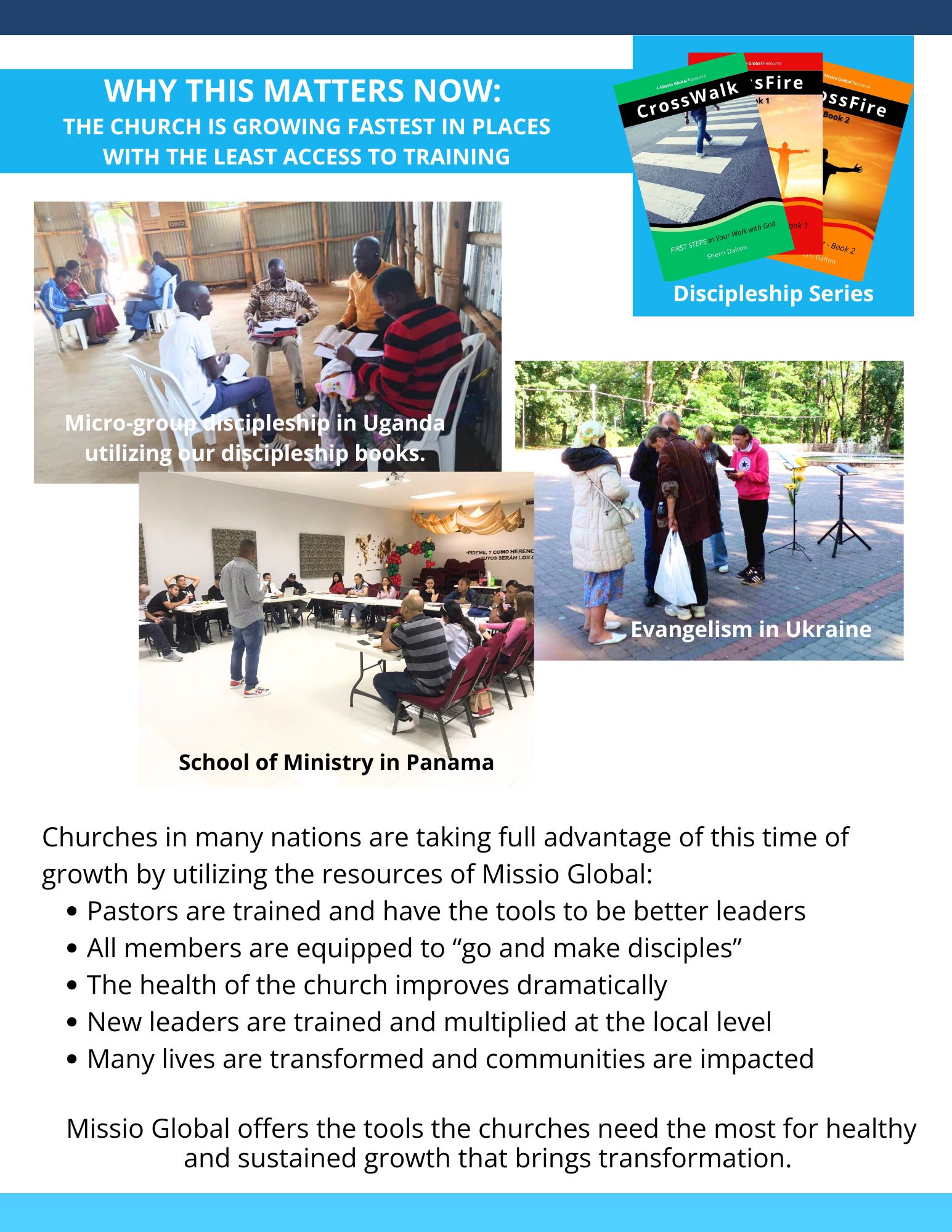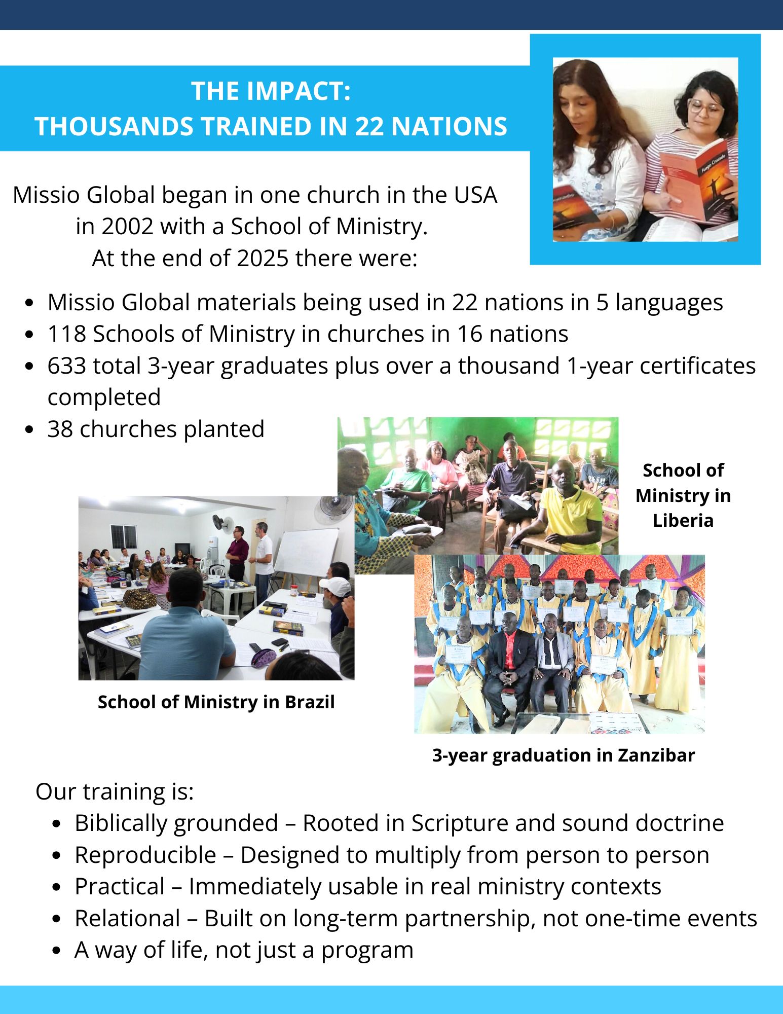 At the last count, there were 61 church-based Schools of Ministry in 13 nations with nearly 1,100 students. These students have reached over 400 people with the Good News of the Kingdom in just this year through their project assignments. Also, 29 new churches have been planted by Missio Global School of Ministry graduates. Plus, several churches are using only our discipleship materials. So more disciples are being made through those churches as well.